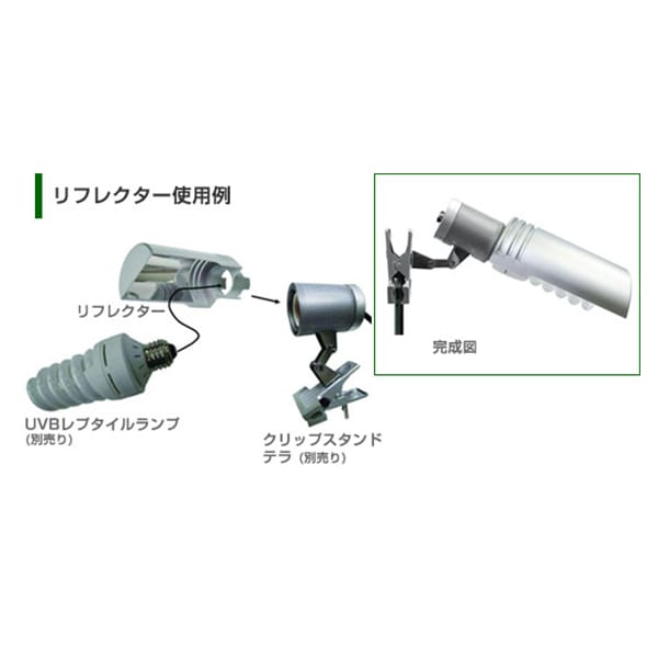 UVBレプタイルランプ用のリフレクターです。UVBレプタイルランプの上面やサイド、必要のない方向への眩しい光を反射し照射対象物へ光を集めます。内側は高反射アルミミラーを装着し、照射方向への照射効率をアップします。 |