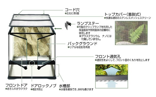 機能的で、デザイン性に優れた爬虫類・両生類用ケージです。 両開きの前面ドアなので、メンテナンスや給餌を簡単ラクラクに行えます。 もちろんドアロックも付いていますので、生体が脱走する心配がありません。 水を入れることも可能で、両生類にもOK!上部のトップカバーは通気性が抜群なメッシュタイプ! 後面上部にコード類を設置できるコード穴があり、すっきり収納可能です。 後面のバックグランウンドはリアルな岩肌で自然なイメージを再現できます。 安心なランプステーが付いていますので、クリップでの保温器具などの設置も可能です。 ※写真の生体や床材などはついておりません。ケージのみの商品です。 ※照明器具はグラステラリウム用紫外線ランプ照射器具「コンパクトトップ」をおすすめします。 |