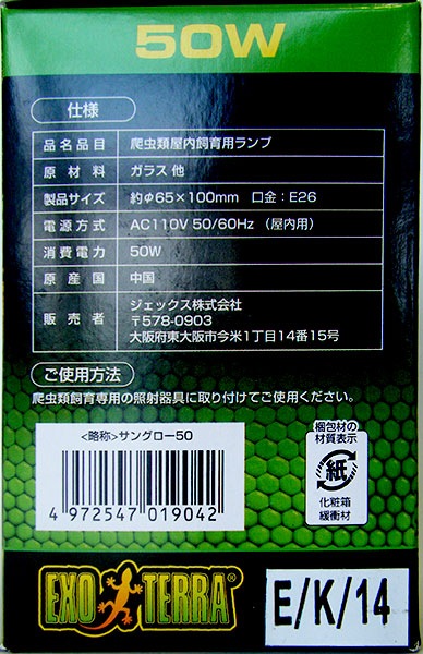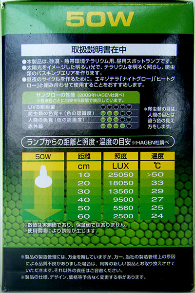 ・本製品は屋内爬虫類飼育用です。他の目的には使用しないでください。 ・必ず爬虫類飼育専用の点灯器具を使用してください。 ・強化ガラスを使用しておりますが、口金部分や点灯器具には、水がかからないように設置してください。破損や感電の原因になります。 ・物でおおったり、燃えやすいものに近づけないでください。火災の原因になります。 ・取り付け、取り外しや掃除の際は、必ず器具の電源を切り、差し込みプラグを抜いてください。 ・生体やディスプレイ、飼育ケージ(プラスチックフレーム、ガラス)などに直接触れないように設置してください。火傷や変形、火災の原因になります。 ・必ずランプの口金(E26)に適合した器具を使用してください。破損や発火の原因になります。 ・ガラス製品ですから、ぶつけたり、無理な力を加えたり、傷をつけたりしないでください。破損やけがの原因になります。 ・点灯中や消灯直後は、ランプが熱いので触れないでください。火傷の原因になります。 ・ランプはソケットに確実に取り付けてください。落下の原因になります。 ・ランプのガラス部分が、器具のソケットに触れないように取り付けてください。発火や破損の原因になります。 ・ランプを併用する時は、ランプ同士を離して設置してください。破損の原因になります。 |