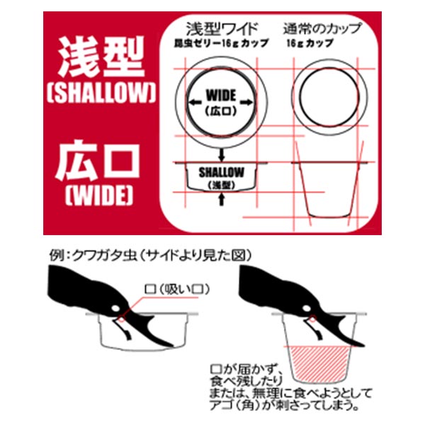 | カブト虫、クワガタ虫が大好きな黒糖蜜をベースに吸収しやすいエネルギー源のトレハロースを配合した嗜好性と栄養が合わさった成虫用ゼリー! とっても食べやすい広口・浅型カップ 自然のエネルギーをそのままゼリー状に した嗜好性の高い、カブト虫、クワガタ虫成虫専用 のエサです。 |