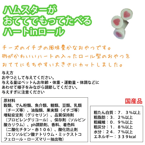 | 商品詳細 | チーズのイチゴの風味豊かなおやつです。 形がかわいいハートの入ったロール型のおやつを おててにもちやすい大きさにカットしました。 |