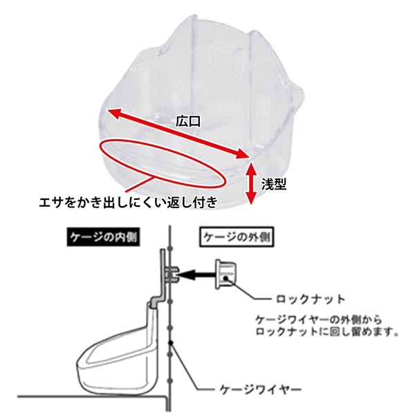| 商品詳細 | 食器の着脱はジョイント部から軽くスライドさせるだけ。 ケージと固定している分、食べやすくまた、生き物が食器をひっくり返してしまうイタズラも軽減します。 |