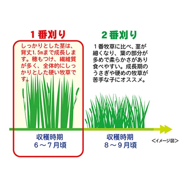 さらに、低カルシウム・低カロリーで、しっかりとした繊維質の多い1番刈りで、毎日の主食をはじめとして、食欲低下にも食べやすく、牧草食のトレーニングにもぴったりの牧草です。