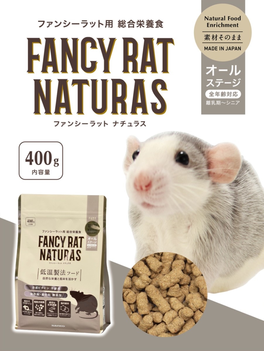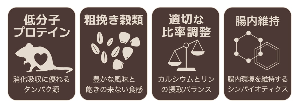 ラット本来の食性を考え、穀物を中心に、合成ビタミンやミネラルは使用せず すべての栄養が自然な食材から |